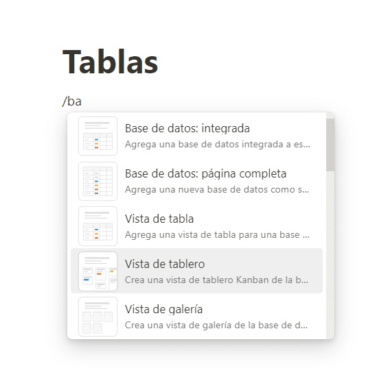 En esta lista de opciones puedes ver las diferentes tablas que existen en Notion. Desde las galerías, los tableros kanban, la tabla y hasta en calendario.